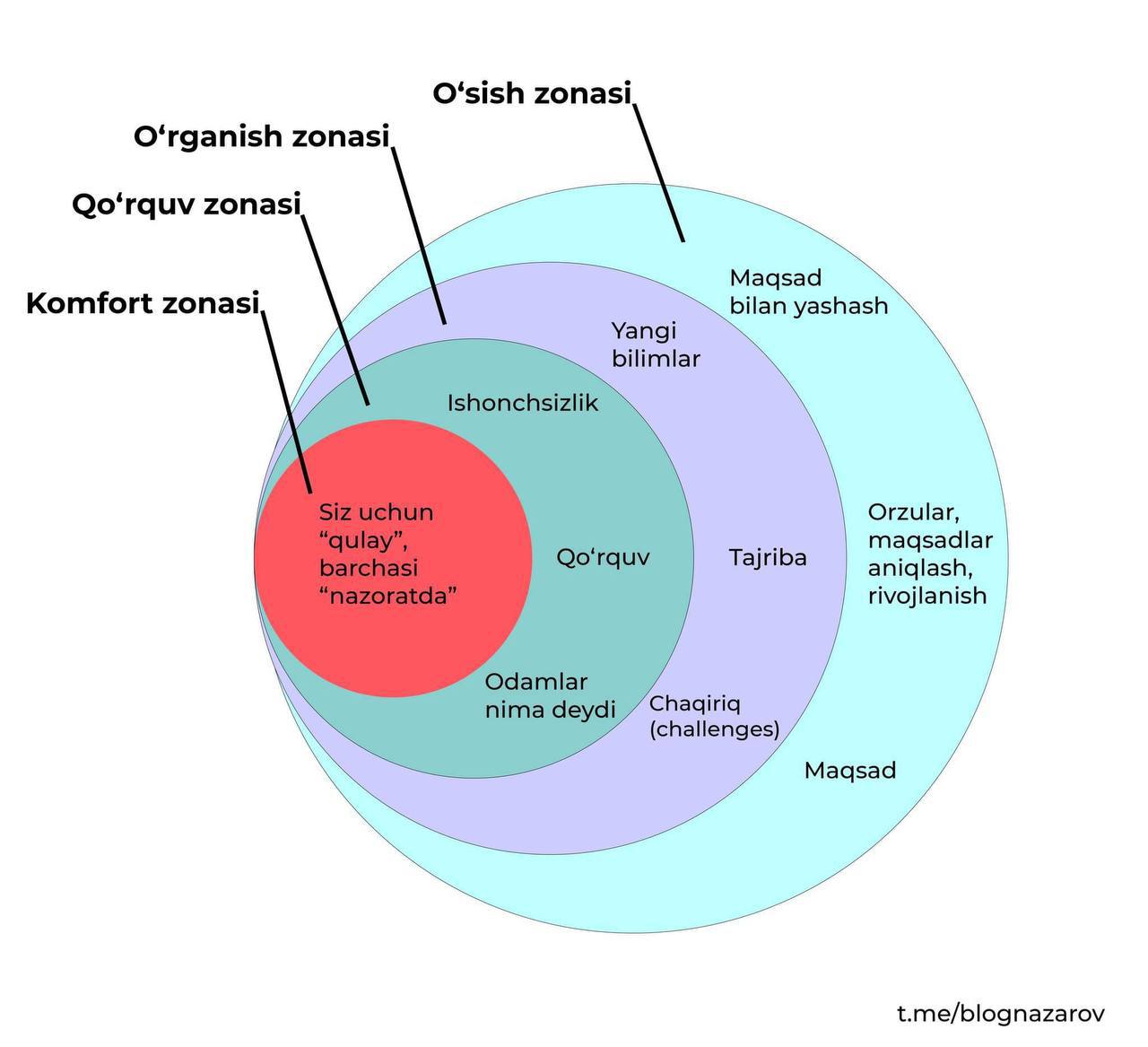 Bugun sizlarga o‘zim o‘rgangan ma’lumot, tajribadan kelib chiqib qanday qilib “komfort zona”dan chiqish, uning etaplari haqida aytib beraman.